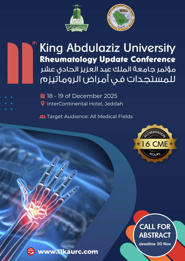 It is my great pleasure to welcome you to the 11th KING ABDULAZIZ RHEUMATOLOGY UPDATE CONFERENCE, I would like to express my most sincere gratitude for your presence and attendance. The meeting as usual will include updates in all aspects in the field of Rheumatology and oral abstract presentations.
